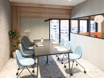 ガラスパーテーションで仕切られた会議室やラウンジエリアがあり、明るく開放的な雰囲気が広がります。