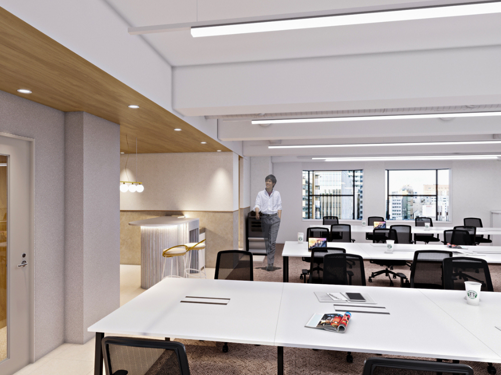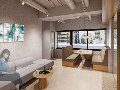 また、カウンター付きのカフェスペースや、くつろぎながら作業ができるラウンジエリアなど、働きやすさを追求した設備も充実しています。