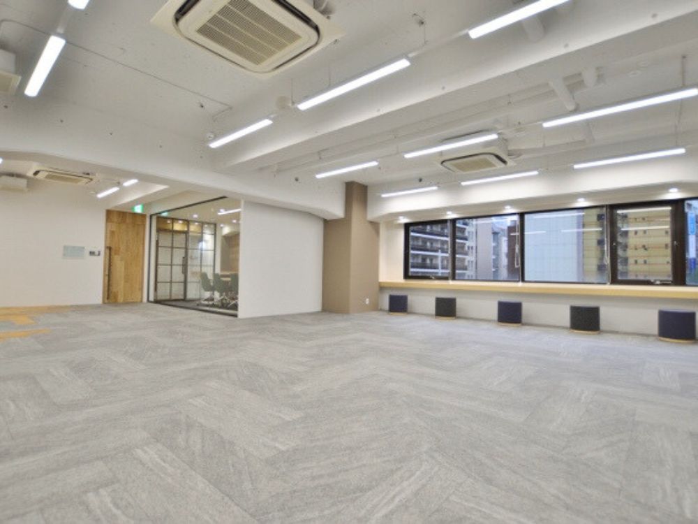 貸室内には受付スペースおよび会議室が完備されており、来客対応や打ち合わせにも対応可能です。大きな窓からは自然光がたっぷり差し込み、明るく開放感のある雰囲気を演出しています。