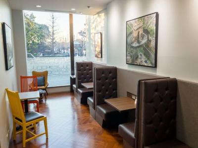 木材を基調とした温かみのあるインテリアに、落ち着いた照明とアートが調和する、上質な空間です。リラックスしながら打ち合わせや作業ができるスペースも設けられており、働きやすい環境が整っています。